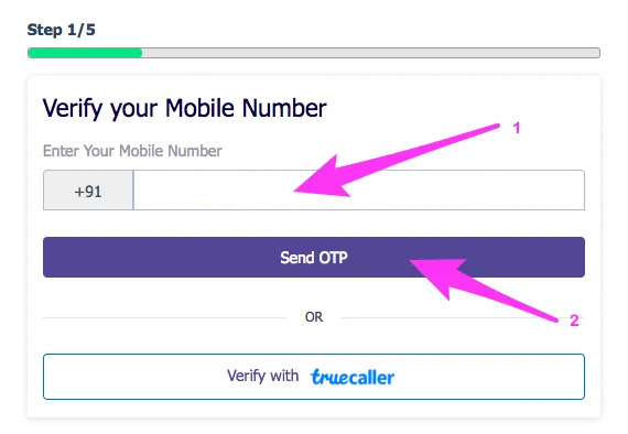 4. You should see the following screen. Verify your phone number by entering your phone number (1) and then click on Send OTP (2).